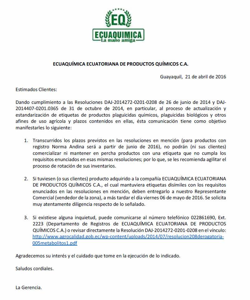 Amigos Distribuidores de Ecuaquímica, compartimos un comunicado de nuestro Departamento de Registros.