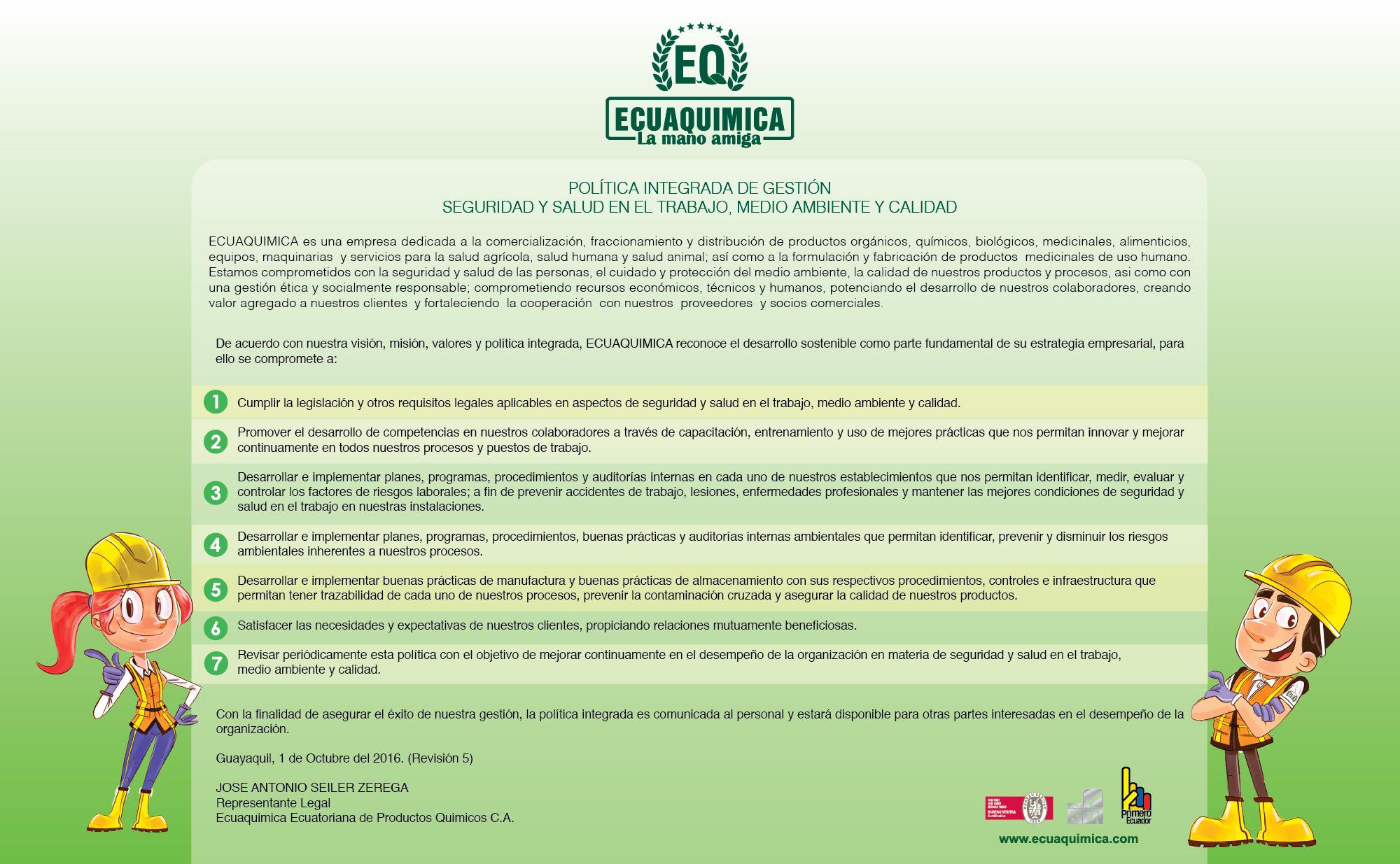 ECUAQUIMICA cuenta con un Sistema Integrado de Gestión (SIG) que cubre todos los aspectos de la organización, desde el aseguramiento de la calidad del producto e incremento de la satisfacción del cliente hasta la realización y mantenimiento de las operaciones dentro de una situación de prevención de la contaminación ambiental y de los riesgos de seguridad y salud ocupacional.